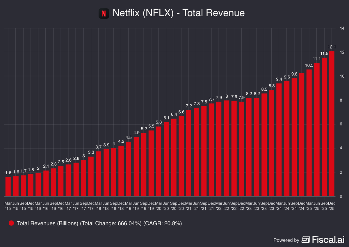 儘管業績優於預期,股價卻重挫 5%,主因是 Netflix 為了在競爭中擊退 Paramount,將收購 WBD 影視資產的報價修改為每股 $27.75 的全現金交易,總估值達 $827 億美元。