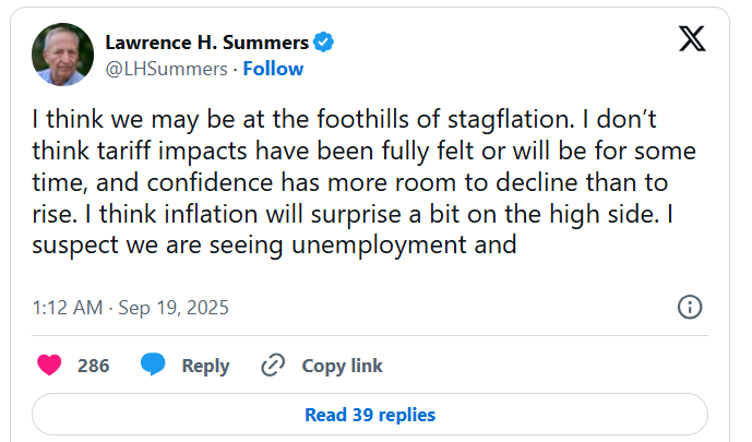 美國前財政部長勞倫斯·薩默斯(Lawrence Summers)上週也表達了類似觀點。他表示,“我認爲我們可能正處於滯脹的初期階段”,同時補充稱,關稅對經濟的影響“尚未完全顯現”。