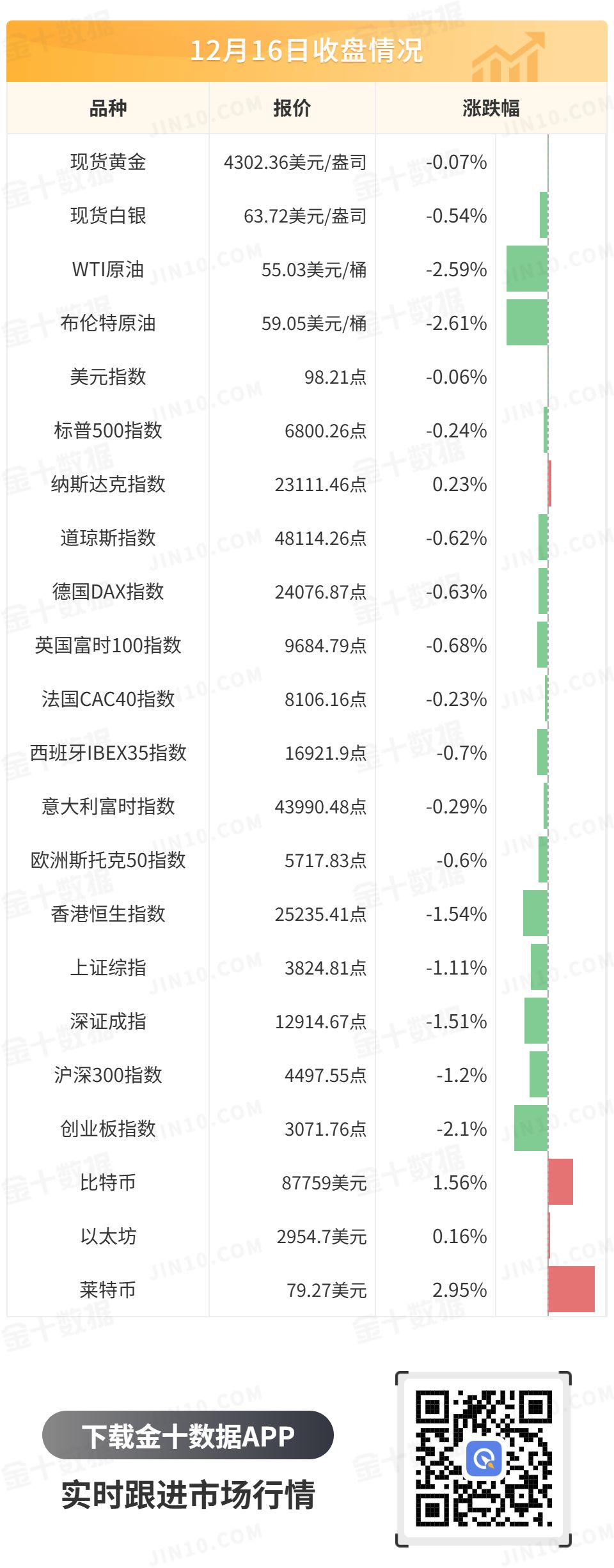 現貨黃金盤中一度重回4330美元上方,但未能站穩此處,再次回至4300大關附近震盪,最終收跌0.07%,報4302.36美元/盎司;現貨白銀在亞盤大跌後小幅反彈,最終收跌0.54%,報63.72美元/盎司。