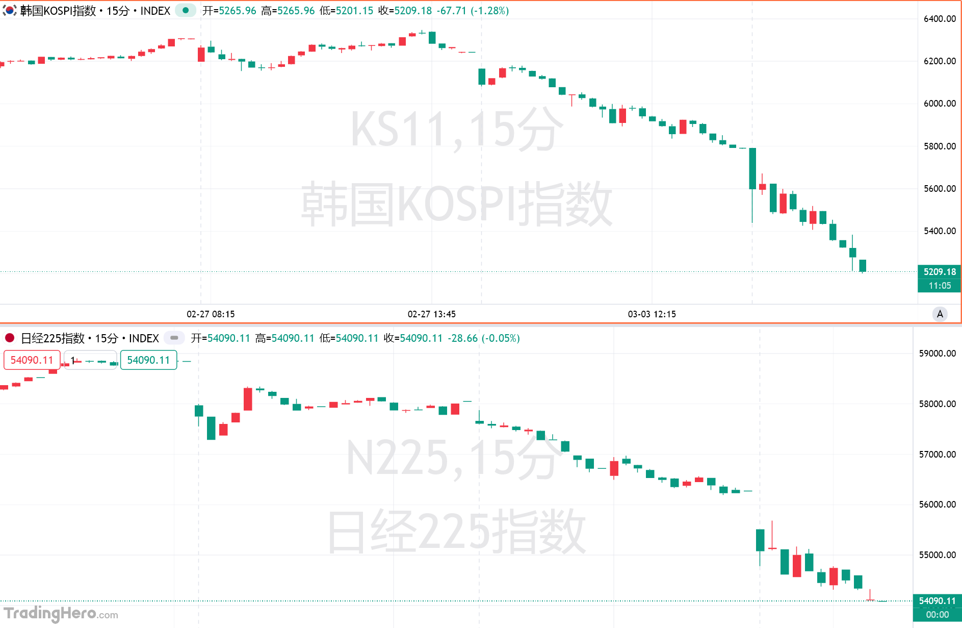 韓國KOSPI指數跌幅更甚,截至發稿日內重挫10%,報5209.64點,韓國股指盤中反覆觸發熔斷。前一交易日KOSPI指數大跌7.2% ,該指數即將迎來2008年以來最大的兩日跌幅。恐慌席捲了韓國的交易櫃檯。截至發稿,韓國交易所解除了對KOSPI指數、KOSDAQ指數的熔斷機制,重新進行交易。