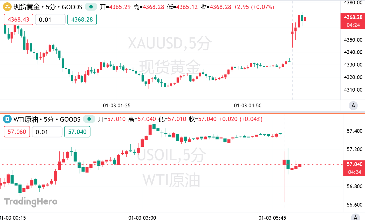 WTI原油週一低開1%,截止發稿報57美元/桶;現貨黃金週一跳空高開,一度突破4370美元/盎司,日內漲0.87%。