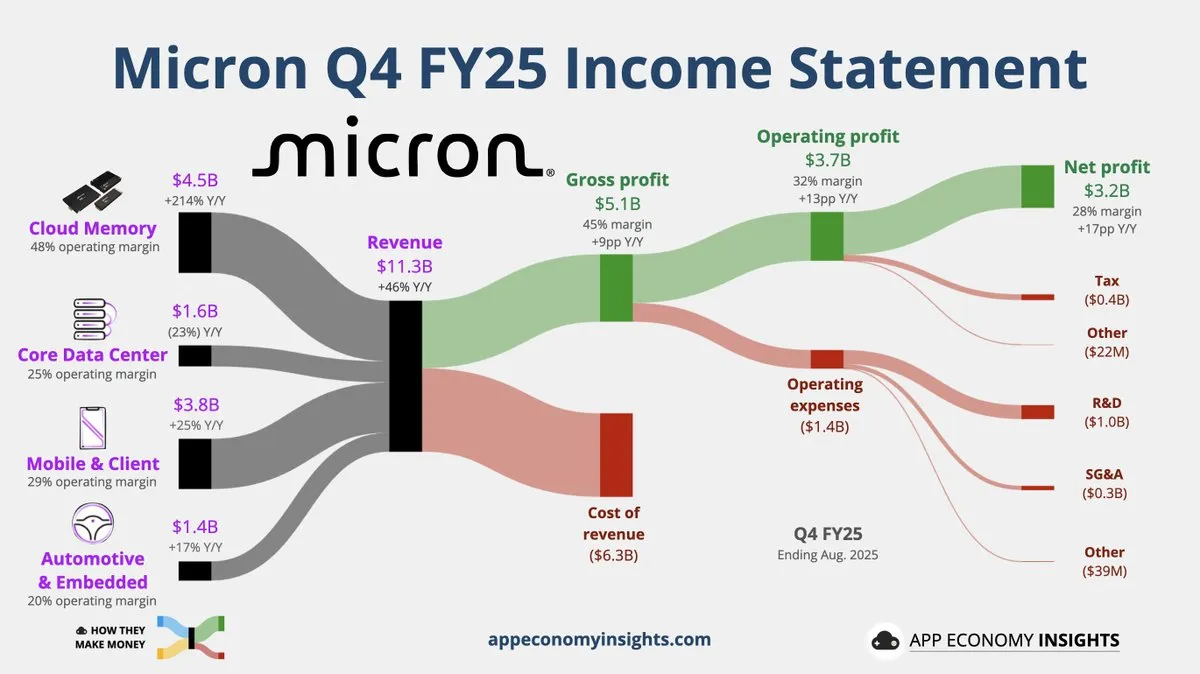 記憶體晶片供應預計在明年仍維持緊張,數據中心與 AI 應用持續推升需求。美光計劃加大資本支出,2025 財年已投入 138 億美元,2026 財年還將增加投資。同時,公司已簽下 HBM3e 合約,並推進下一代 HBM4,確保未來營收穩定並保持技術領先。
