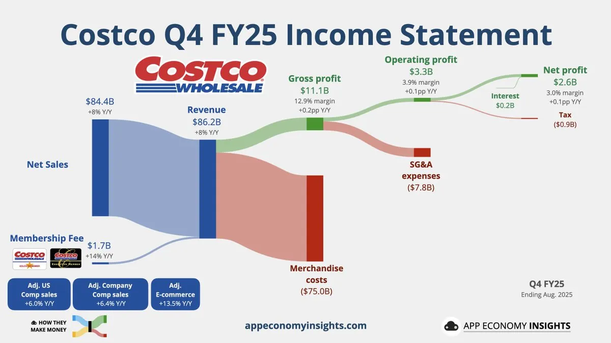 隨著美國消費者在通膨和經濟壓力下積極尋求「物有所值」的平價商品,好市多憑藉其會員制模式,展現了優於整體零售業的穩健成長。公司自有品牌的強勁銷售,以及對奶油、雞蛋等特定商品維持低價,也成為業績的助力。第四季度的淨銷售額增長了 8.0%,達到 844 億美元,高於去年同期的 782 億美元