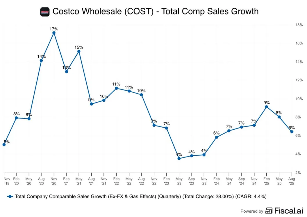 總體同店銷售:總體同店銷售增長 5.7%。若排除汽油價格變化和外匯影響,調整後的總體同店銷售增長 6.4%,這接近市場預期的 6.44%