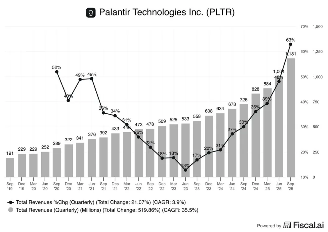 第三季營收猛增 63%(達 11.8 億美元),遠超分析師預期,並且連續 21 個季度都超出預期。公司因此上調了全年財測。尤其在美國的 AI 業務上,商業客戶銷售額激增 121%,政府銷售額也增長了 52%。執行長 Alex Karp 甚至稱這是「軟體公司有史以來最好的結果」。