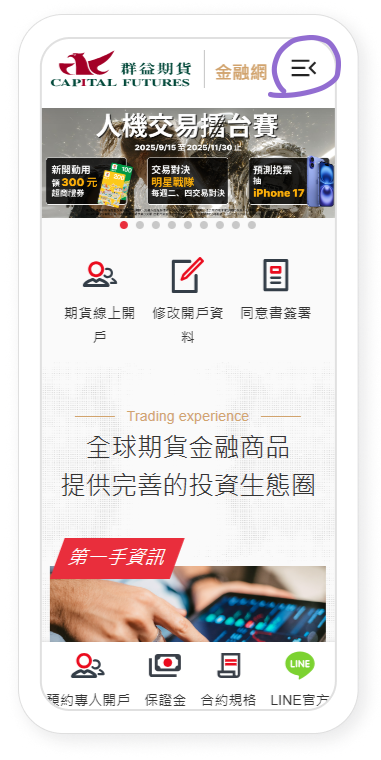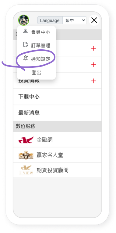 2.點擊左上角會員頭像並進入通知設定 (需登入)